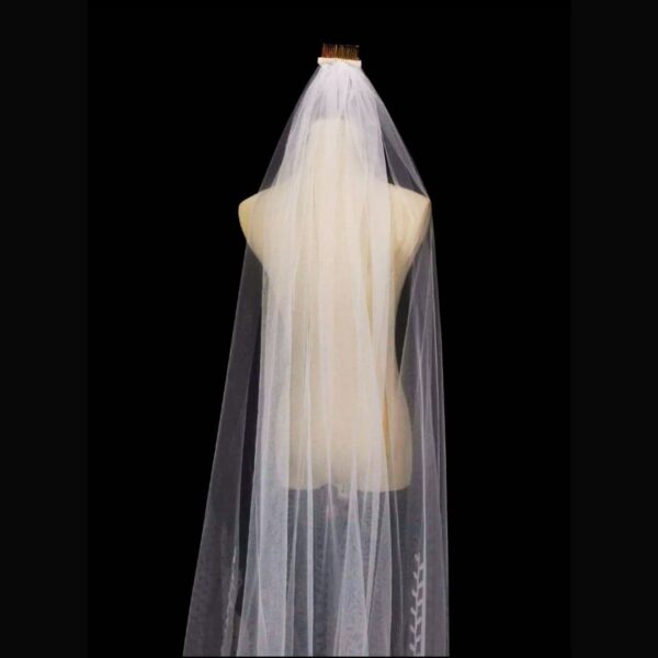Make a statement on your big day with this stunning long cathedral veil. The veil is made with soft, flowing tulle and is adorned with delicate lace leaf designs that adds a touch of romance and elegance to your bridal look.